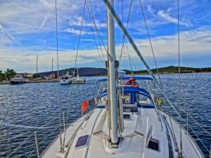 Der Wind ist leider wieder nicht so optimal, wie wir es gerne hätten. Wir segeln hart am Wind und müssen öfter kreuzen. Die ganze Fahrt über haben wir totale Schräglage. Endlich an der Insel Ilovik angekommen, wollen wir in die nördliche Bucht. Sie erscheint uns aber etwas sehr klein, um uns gegen die wechselnde Windrichtung zu schützen. Also fahren wir an den nördlichen Zipfel der Insel. Hier könnten wir ankern, wenn nicht schon zwei Segler schneller gewesen wären. Wobei die schöne Bucht nicht so recht gegen nördliche Winde geschützt ist. Dann nehmen wir heute mal eine Plutaca. In Ilovik steuern wir die nördlichen Bojen an. Massenhaft freie gelbe Blechbojen. Gleich beim ersten Mal habe ich eine erwischt. Doch da der Wind und die starke Strömung aus ve