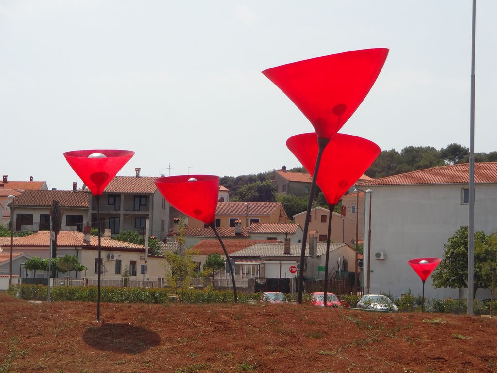 Eins darf ich nicht vergessen zu zeigen, diese Riesen Blumen aus rotem Glas. Es sind Leuchten und bei Nacht wirklich ein richtiger Hingucker. Als wir sie bei unserer Ankunft am großen neugebauten Kreisel in Pula entdeckten, waren wir gleich begeistert.