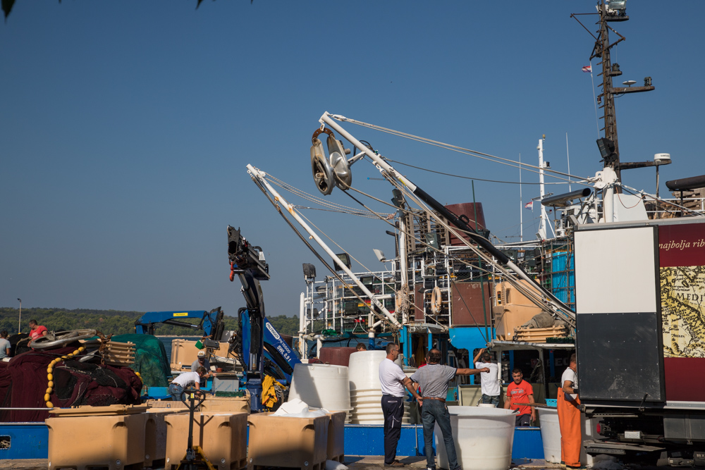 Unterwegs fällt uns in einer Seitenstraße ein Banner mit Werbung für das Olivenölmuseum auf. Da könnten wir später, wenn es noch geöffnet hat, mal rein gehen. Aber erst mal sind die Fischerboote dran. Bei einem der Großen wird gerade der frische Fang in einen LKW verladen, danach wird das große Netz über eine Rolle wieder fein säuberlich bereit gelegt. Die Mannschaft muss dabei recht ordentlich zupacken.