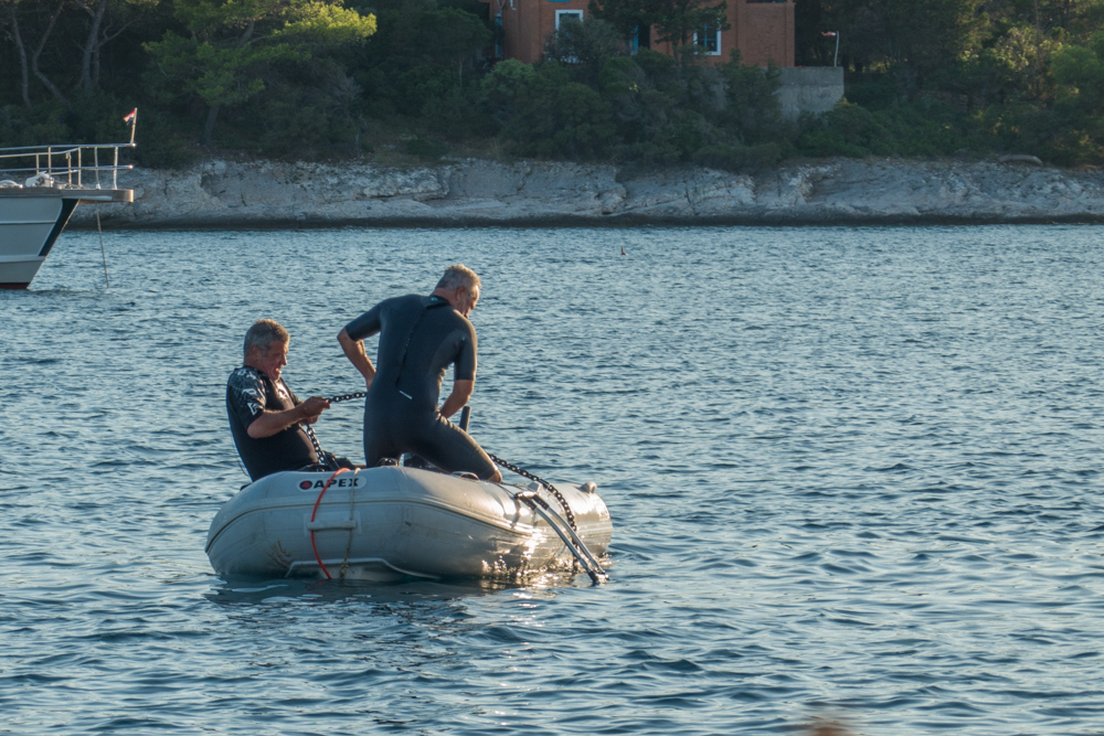 Es ist sehr mysteriös, wie kann dieser platzanweisende Skipper wissen wo genau sich diese Kette unter Wasser befindet. Und dann hat er glücklicherweise gerade zwei Taucher an Bord, die auch nicht besonders professionell gearbeitet haben, sich aber dafür sehr gut auf seinem Boot auskennen. Ich glaube die gehören zur Crew genauso wie seine Frau Kristina und ihr Hund.