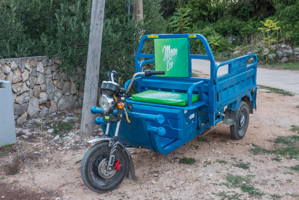 Die engen Gassen der Insel sind nur für kleine Fahrzeuge geeignet. Neben der kleinen Kirche steht eines dieser Transportmittel mit Elektroantrieb, so eins hat auch Wolfgang noch nicht gesehen.