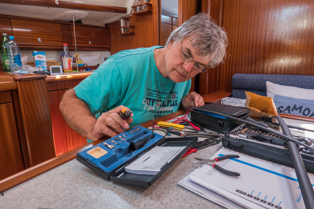 Ich sitze auf der Bank und warte, ab und zu reiche ich Wolfgang ein Werkzeug, ansonsten kann ich im Moment nichts tun. Ohne Strom kein Staubsauger, keine Pumpe für Frischwasser und einiges mehr.